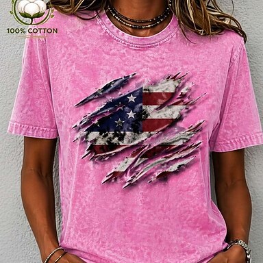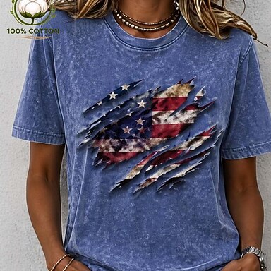 T-shirt en 100 % coton pour femme pour le Jour de l'Indépendance américain imprimé graphique drapeau drapeau américain basique élégant classique manches courtes col rond hauts réguliers décontractés