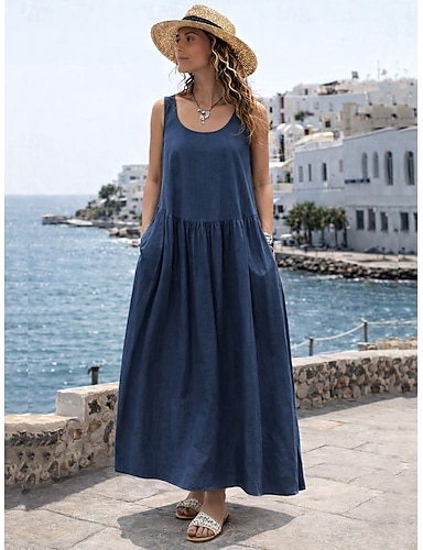 Femmes Robe maxi Faux coton lin Robe trapèze Robe d'été Robe Nuisette Occasionnel Quotidien Coupe Ample Uni Sans manches Col ras du cou Bleu marine Été Printemps Automne