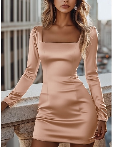 Femmes Mini Robe Robe en Satin Robe moulante Élégant Mode Moderne Extérieur Vacances Occasion Spéciale Mince Uni manche longue Col carré Champagne Printemps Automne