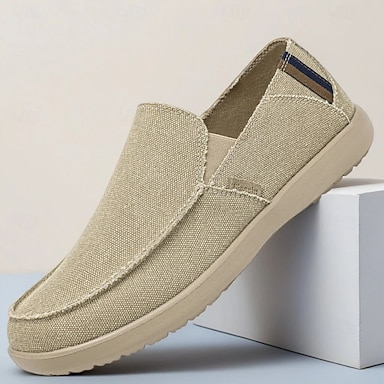 Chaussures beiges en toile pour homme, à enfiler, construction souple et légère, style décontracté minimaliste, adaptées au quotidien, aux voyages et aux loisirs.