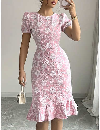 Femmes Robe Midi Robe en Dentelle Moulant Robe Trompette Sirène Élégant Mode Moderne Vacances Mariage Sortir Coupe régulière Fleuri Manche Courte Col ras du cou Bleu Noir Blanche Rose Claire