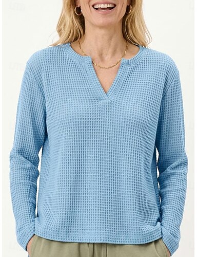 Femmes Tee-shirt Gaufre Élégant Classique manche longue Col ras du cou Hauts Réguliers Occasionnel Noir Blanche Jaune Rose Claire Vin Printemps