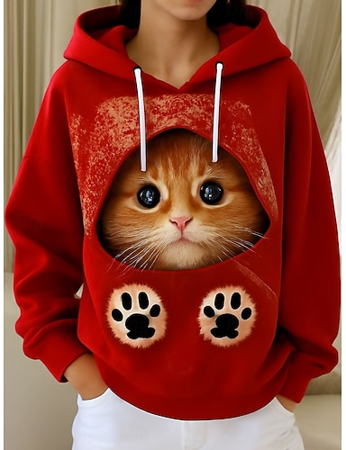 Femmes Pull Sweats à capuche Graphique Chat Mode Streetwear Gothique manche longue À capuche Hauts Réguliers Tenue Quotidienne Occasionnel Cordon de serrage Imprimé Rouge Printemps Automne