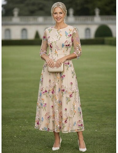 Ligne A Robe Longueur thé Robe de Cocktail Robe d'invité de mariage Robe de Mère de Mariée Manche 3/4 Col ras du cou Élégant Occasionnel Formel robe demoiselle d honneur Kentucky Derby Chiffon Tulle