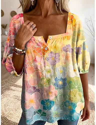 Femmes Chemisier Imprimé Fleuri Graphique Quotidien Élégant Occasionnel Demi Manches Col carré Hauts Réguliers Occasionnel Quotidien Bleu Jaune Rouge Violet Été Printemps
