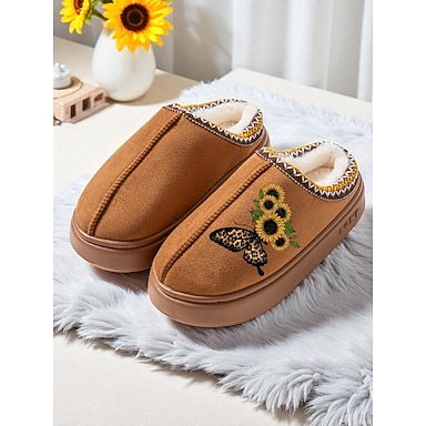 Pantoufles pour femmes à imprimé tournesol - chaussons d'intérieur chauds doublés polaire avec motif papillon, chaussures confortables pour la maison, idéales comme cadeaux d'hiver