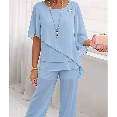 Femmes Ensembles deux pièces Mousseline de Soie Manche Courte Papillon Col carré Couleur Unie Uni Superposé Élégant Formel robe demoiselle d honneur Décontracté Quotidien Bleu Bleu Ciel Été Coupe