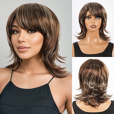 perruque courte coupe lutin pour femme, cheveux courts ondulés, lisses et dégradés, coupe lutin avec frange, cheveux synthétiques, aspect naturel, pour une utilisation quotidienne en soirée