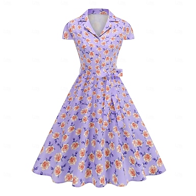 Années 1950 Hepburn Rétro Vintage Midi Robe Trapèze Robe trapèze Robe Évasée Manches courtes Fleuri Ligne A Déguisement Femmes Carnaval Saint-Valentin Mascarade Vacances Tenue Quotidienne Enterrement