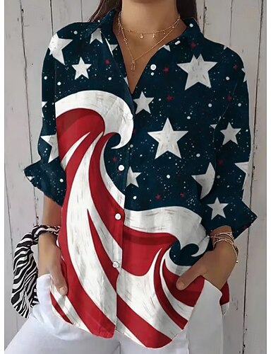 T-shirt Femme Journée de l'Indépendance Américaine Imprimé Graphique Boutons Anniversaire d'Amérique Vintage Élégant Moderne À Manches Longues Col de Chemise Hauts Quotidiens Bleu Noir Été Printemps