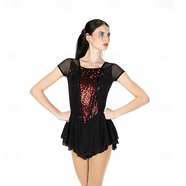 Robe de patinage artistique Femmes Patinage Robe Noir Patchwork Dos Nu Élastique Entraînement Compétition Tenue de Patinage Classique cristal pailleté Manche Courte Patinage sur glace Patinage