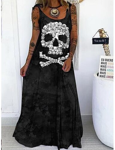 Robe maxi imprimée de crânes pour femmes robe d'été robe de glisse casual quotidien coupe régulière crâne sans manches col U noir blanc rouge violet été