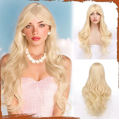 perruques de film barbiecore longues perruques blondes avec une frange pour les femmesperruque de cheveux ondulés synthétiques avec des racines sombres