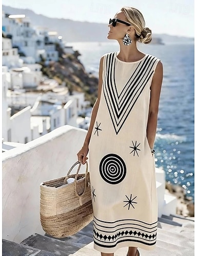 Femmes Robe Midi Robe fourreau Robe d'Été Robe trapèze Vacances Occasionnel Boho Plage Sortir Coupe régulière Graphique Géométrique Sans manches Col Rond Marron clair Kaki Été Printemps