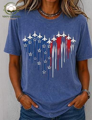 Jour de l'Indépendance américaine chemise femme 100% coton impression graphique drapeau stylé basique classique à manches courtes col rond hauts longs décontractés quotidien bleu rose violet clair