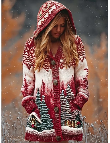 Gilet Femmes Noël Vintage Quotidien Ethnique Style Dégradé de Couleur Côtelé À Capuche Poche Boutons Imprimé Manches Longues Longs Tops Tricot Extérieur Week-end Rouge Automne Hiver