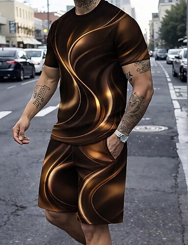 Homme Géométrique Ligne 2 pièces Ensembles de tees Hauts d'été Manche Courte Pantalon court Col ras du cou Occasionnel Tendance Quotidien Extérieur Vacances Impression 3D Été Bleu Rouge Marron