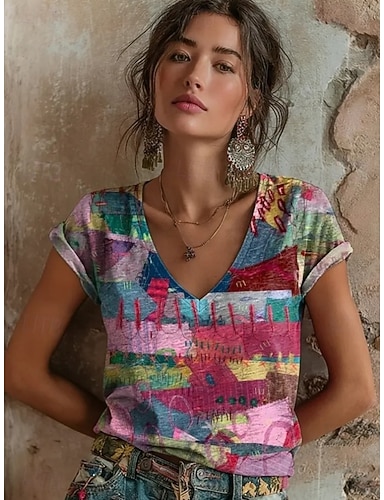 Femmes T-shirt Imprimé Graphique Abstrait Géométrie ancien Élégant Classique Manche Courte Col en V Hauts Réguliers Occasionnel Quotidien Sortir Bleu Beige clair Vert Claire Violet Claire Violet Ét