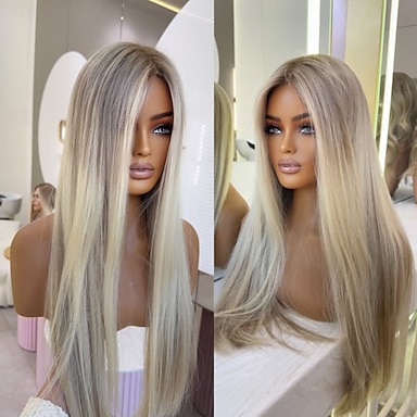 Perruque brésilienne 100% cheveux vierges, sans colle, blond cendré méché, avec lace closure 5x5, blond lisse multicolore, lace frontale 13x4, implantation naturelle pré-épilée.