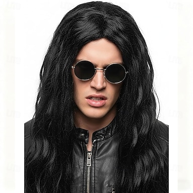 Perruque longue noire pour homme, cheveux noirs bouclés pour une soirée à thème hippie