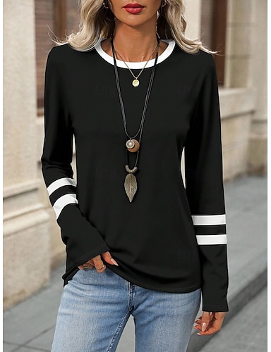 Femmes T-shirt Imprimé Graphique Rayé Mode Élégant Classique manche longue Col ras du cou Col rond Hauts Réguliers Quotidien Week-end Noir Été Printemps Automne