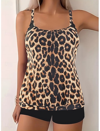 Tankini femme 2 pièces maillot de bain léopard shorts contrôle du ventre taille haute slim dos nu vêtement de plage vacances feuillage col rond sans manches
