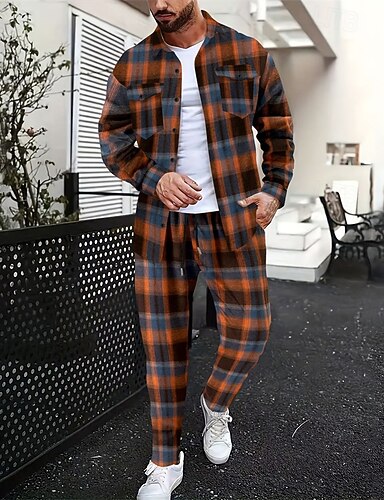 Homme Costumes de chemise Ensembles T-shirt Ensembles chemise et pantalon Tenues 2 pièces Manche Courte Revers Printemps Automne Plaid Mode Occasionnel 2 pièces Boutons Vacances Tenue quotidienne