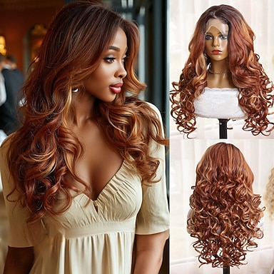 Perruque en dentelle synthétique Bouclé Style 26 pouce Brun avec des points forts dorés Partie médiane 13x5x1 Lace Front Perruque Femme Perruque Noir / Rouge