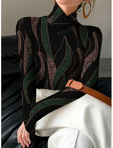 Femmes T-shirt Imprimé Graphique Abstrait Géométrie Élégant ancien Classique manche longue Col haut Col asymétrique Hauts Réguliers Quotidien Vert foncé Printemps Automne Hiver