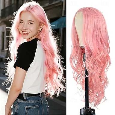 Perruque rose pour femme, 66 cm de long, ondulée, en fibres synthétiques, avec raie au milieu. Aspect naturel, résistante à la chaleur, idéale au quotidien ou pour un cosplay ou une soirée. &Halloween
