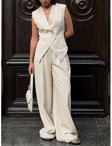 Femmes Ensembles en coton et lin Gilet en coton et lin Ensembles de Pantalons Sans manches Col ras du cou Couleur Unie Mode Streetwear Occasionnel Quotidien Extérieur Blanche Jaune Beige Été Coupe