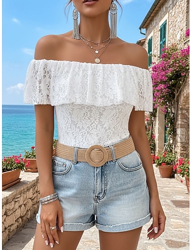Femmes Chemisier Hauts en dentelle Dentelle Uni Élégant Manche Courte Épaules Dénudées Hauts Réguliers Fête Sortir Blanche Été Printemps