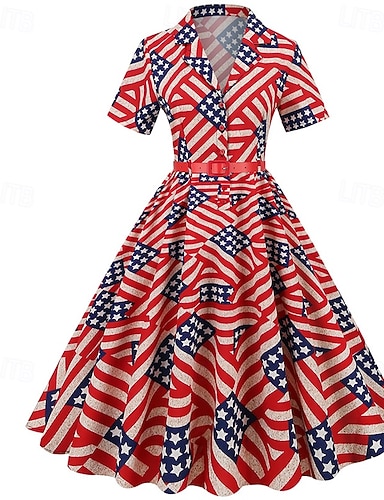 Robe midi patriotique pour femmes du jour de l'indépendance Robe d'été plissée robe de vacances décontractée loose fit graphique rayé drapeau à manches moitié col rond rouge bleu bleu foncé été