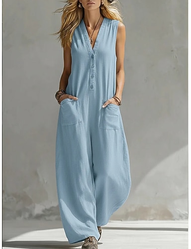 Femmes Combishort Streetwear Couleur Unie Sans manches Jambe large Col en V Avec Poches Quotidien Vacances Coupe régulière Noir Vert Véronèse Rouge Été