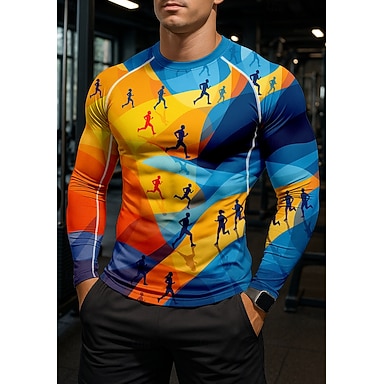 Homme Géométrique T-shirt de compression Haut de course T-shirt de course Printemps Automne Impression 3D manche longue Séchage Rapide Compression Power Flex Évacuation de l'Humidité Respirant