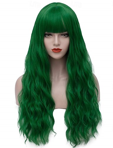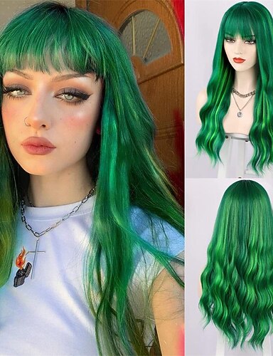 Parruques Vertes Perruque Longue Bouclée Ondulée Verte avec Frange pour Femmes Synthetid Résistante à la Chaleur Costumes Wigs