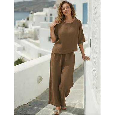 Femmes Ensembles en coton et lin Ensembles deux pièces Chemisier Pantalons Sans manches Col ras du cou Couleur Unie Élégant Mode Streetwear Occasionnel Quotidien Extérieur Noir Jaune Bleu Marine Été