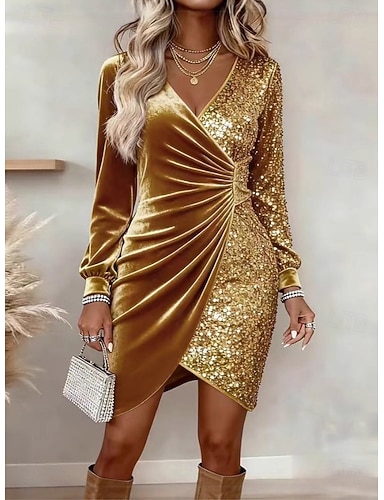 Nouvel An Femmes Mini Robe Robe fourreau Élégant Fête Anniversaire Vacances Soirée Mariage Couleur Unie manche longue Col en V Rouge vin Noir Dorée