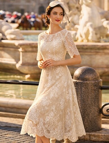 Ligne A Longueur thé Robe de Soirée Robe de Cocktail Robes de mariée Robes pour enterrement de vie de jeune fille robe de mariée Élégant Petites Robes Blanches Manche Courte Col ras du cou Formel