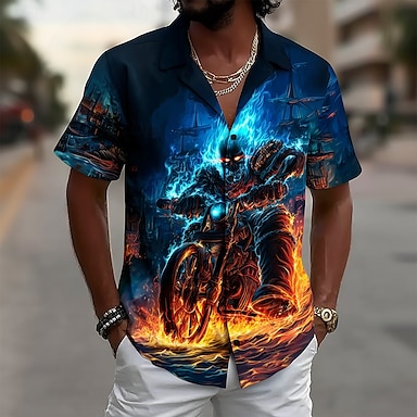 Homme Crâne Flamme Voilier Chemise Chemise à col cubain Chemise Boutonnée Manche Courte Punk gothique sombre Fête Vêtements de rue Été Chemise à col camp Impression 3D Bleu 2# Bleu 1#
