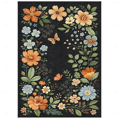 Tapis à motif floral sur fond noir, orné de fleurs et de papillons aux couleurs vives. Élégant tapis décoratif, idéal pour le salon, la chambre ou la décoration intérieure.