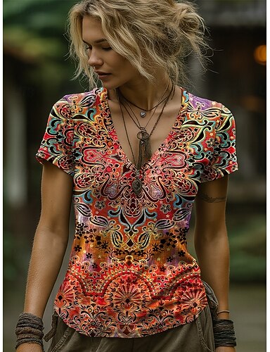 Femmes T-shirt Imprimé Graphique Paisley Plantes Bohème ancien Élégant Manche Courte Col en V Hauts Réguliers Quotidien Sortir Week-end Bleu Noir Rose Claire Orange Marron Été Printemps