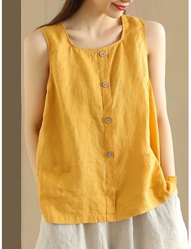Femmes Faux coton lin Froncé Boutons Couleur Unie Élégant Basique Occasionnel Sans manches Col carré Hauts Réguliers Quotidien Bleu Jaune Marron Été Printemps