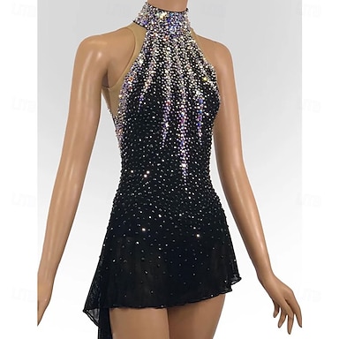 Robe de patinage artistique pour femmes et filles, noire, extensible, pour entraînement, compétition, vêtements de patinage, thermique, chaude, cristal/strass, sans manches, patinage artistique