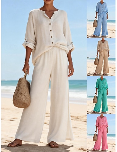 Femmes Ensembles de Pantalons Faux coton lin manche longue Col en V Couleur Unie Uni Mode Streetwear Occasionnel Quotidien Extérieur Bleu Blanche Rose Claire Été Coupe Ample