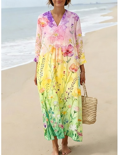 Femmes Robe maxi Robe trapèze Vacances Occasionnel Boho Extérieur Plage Sortir Coupe Ample Fleuri Graphique Demi Manches Col en V Bleu Rose Claire Orange Vert Été Printemps