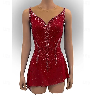 Robe de patinage artistique pour femmes et filles, tenue de patinage sur glace rouge, extensible, tenue de compétition, thermique, chaude, cristal/strass, sans manches, patinage artistique