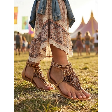 sandales à bride cheville perlées bohème pour femmes – chaussures d'été plates à imprimé tribal pour les sorties décontractées à la plage