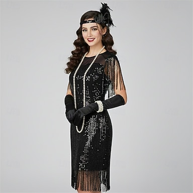 Set Années Folles Années 1920 Mi-long Robe Charleston Tenues Ensemble d'accessoires avec accessoires Manches courtes Gatsby le Magnifique Invité au mariage Paillettes Frange à pompons Paillettes