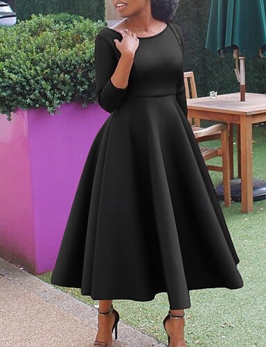 A-Ligne Robe de Fête Longueur Thé Robe de Cocktail Robe d'Invité de Mariage Robe de Mère de la Mariée Manches Longues Col Ronde Élégante Vintage Fête Spandex avec Plis Couleur Bloquée